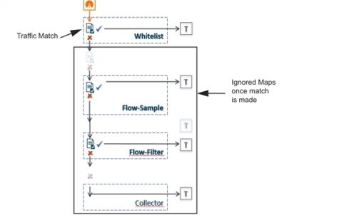 In this scenario, once traffic matches a map, it will be sent to the destination for that map. However, the matched traffic will also be evaluated by subsequent maps and, if a match occurs, it will be sent to each of the destinations pointed to by the subsequent maps.