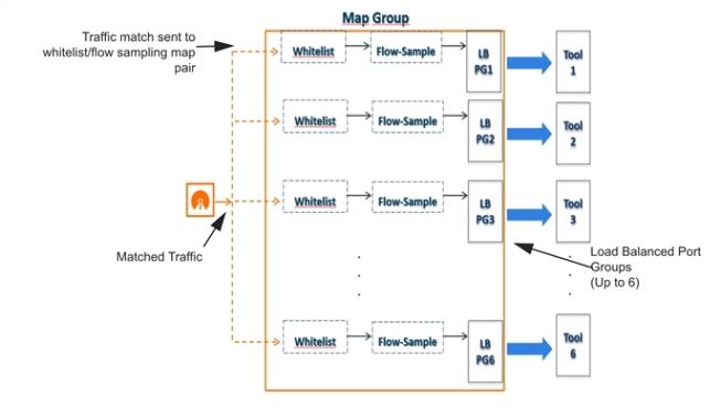 A maximum of six flow sampling maps sending traffic to six different port groups can be configured per GigaSMART group (gsgroup).