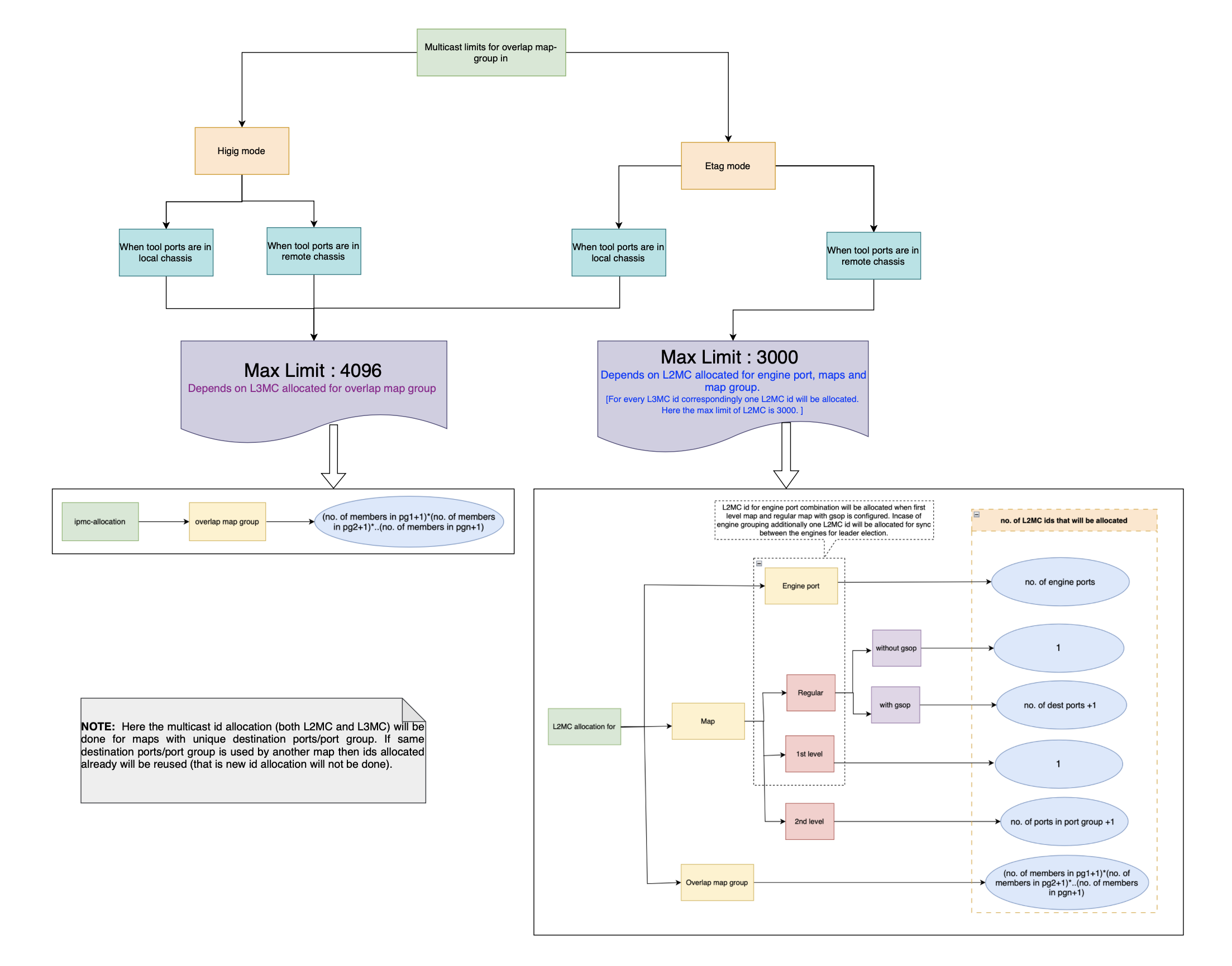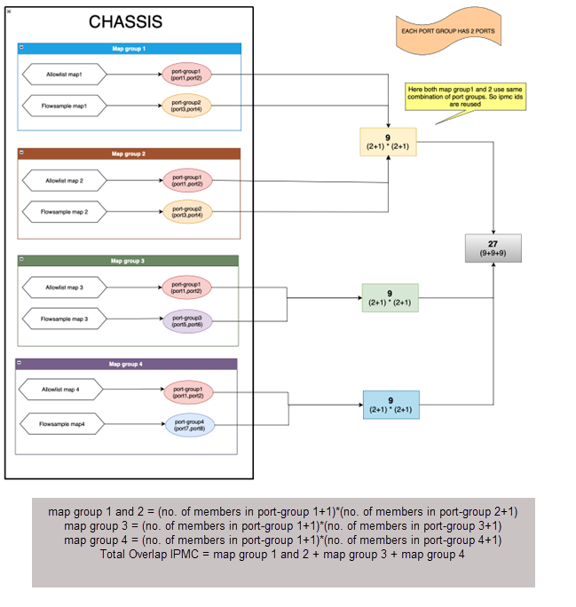 If Port Groups are utilized across multiple map groups in a single cluster, refer to the representation below on how the multicast IDs are calculated.