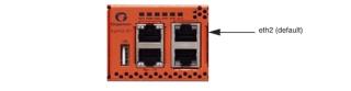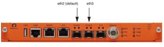 Refer to 1 for the location of the two stack ports, eth2 (default) and eth3 on the control card in the front of GigaVUE‑HC3. You can use either one or both the stack ports for GigaSMART connectivity.