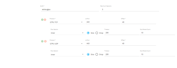 This example shown in creates a GigaSMART Advanced slicing operation named eslice-gtpu. In this operation, slicing occurs at HTTPS (port 443) over GTPu-TCP and GTPu-UDP traffic after 10 packets for each TLS connection. This operation truncates all packet data starting 40 bytes after the TCP header. The slicing starts after TCP header gets encapsulated by GTP.