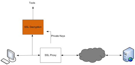 Passive TLS/SSL decryption can also be deployed close to an TLS/SSL proxy, with the server in the Enterprise domain as shown in 4.