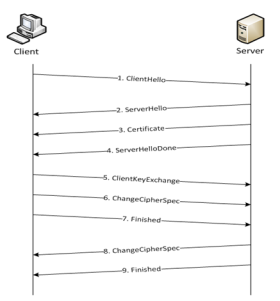 1 shows the basic TLS/SSL handshake between a client and server to establish a session. The messages are unencrypted up to step 6 in 1. The messages are encrypted after step 6, including the step 9 Finished message.