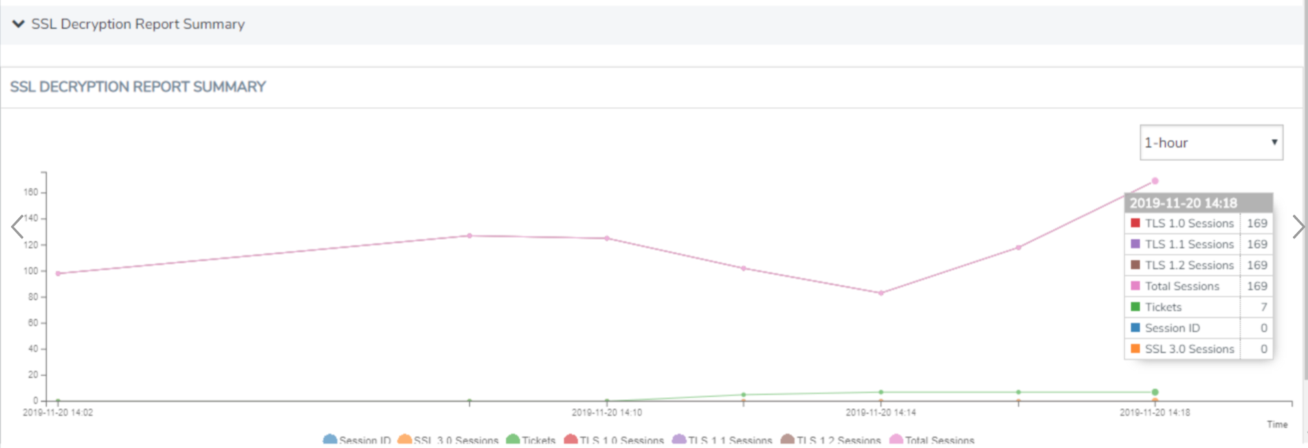 In the Session Summary table, click the Report Summary link to view the graphical representation of the trending data for the Passive SSL Decryption session summary as shown in the following figures:
