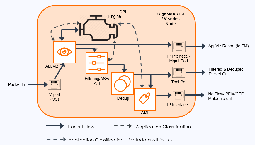 Gigamon Application Intelligence uses the Deep Packet Inspection (DPI) engine to classify and filter applications and export application metadata. When packets arrive, the DPI engine analyzes the first few packets for each flow to classify the application. It then collects and exports the application statistics to GigaVUE-FM (destination port 2056) using the management interface by default.
