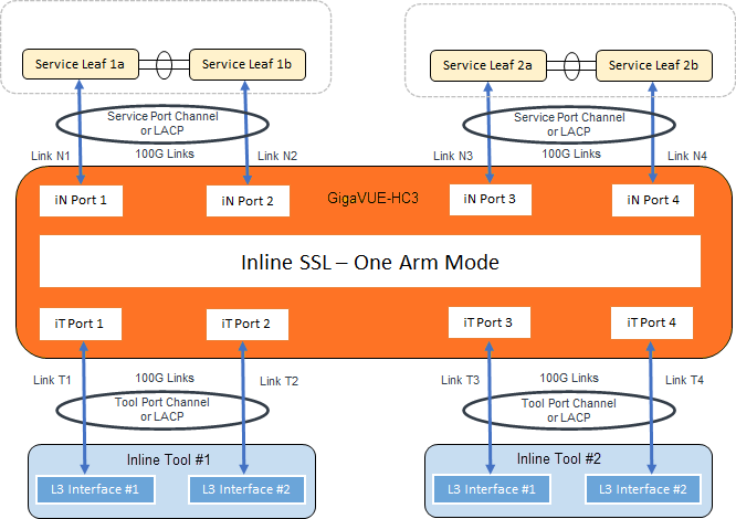 In the above figure, the inline network link and inline tool link works as a pair – (N1, T1), (N2, T2), (N3, T3), and (N4, T4). The GigaSMART sends traffic to the corresponding tool link of the received network link. Similarly, GigaSMART sends the traffic back to the server on the corresponding network link of the received inline tool link. For example, when a connection comes to GigaSMART from the inline network N1, after decryption, GigaSMART sends clear text traffic to inline tool on T1. The return traffic of the same connection arrives at GigaSMART on the inline tool link T2. GigaSMART then re-encrypts the traffic and sends it to the server on the inline network link N2.