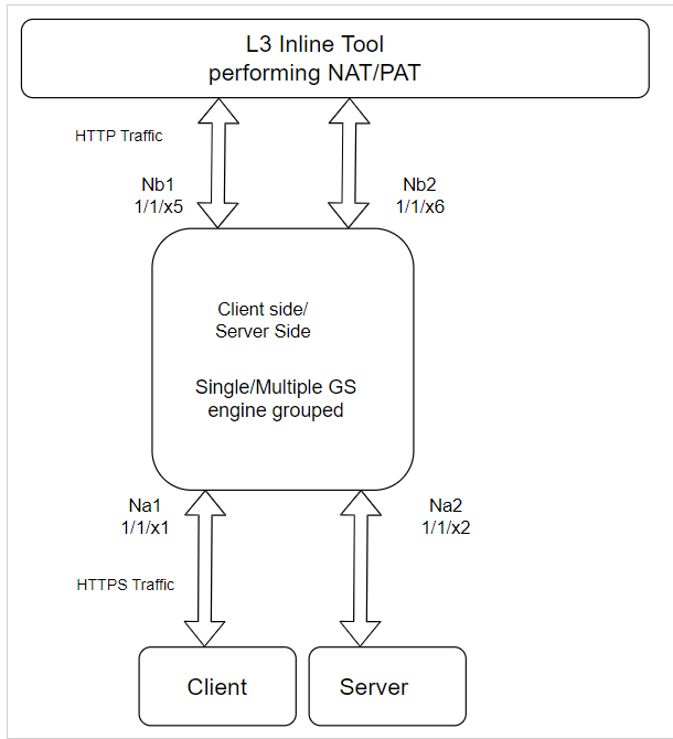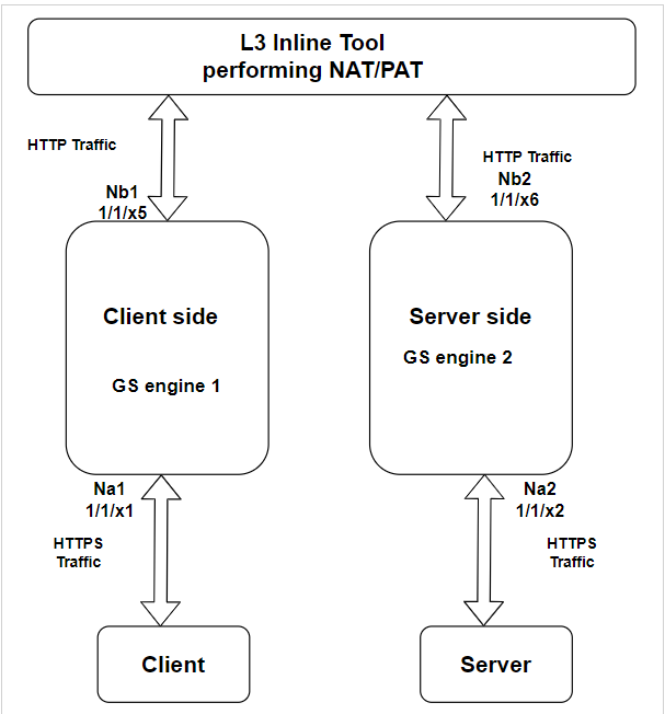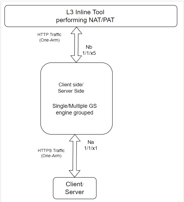 This feature focuses on a new approach in GigaSMART to offload TLS decryption from Layer 3 inline-tools performing NAT/PAT (Network Address Translation / Port Address Translation) on the traffic passing through them. The GigaSMART engine maintains two separate sessions towards the client and server-side to achieve this.
