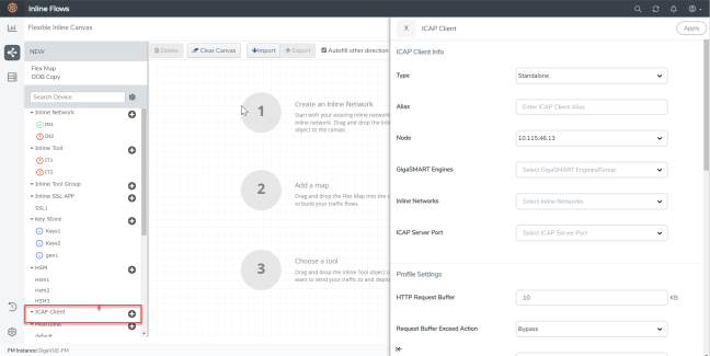 In the displayed Flexible Inline Canvas, select the device where you want to configure the ICAP Client. |