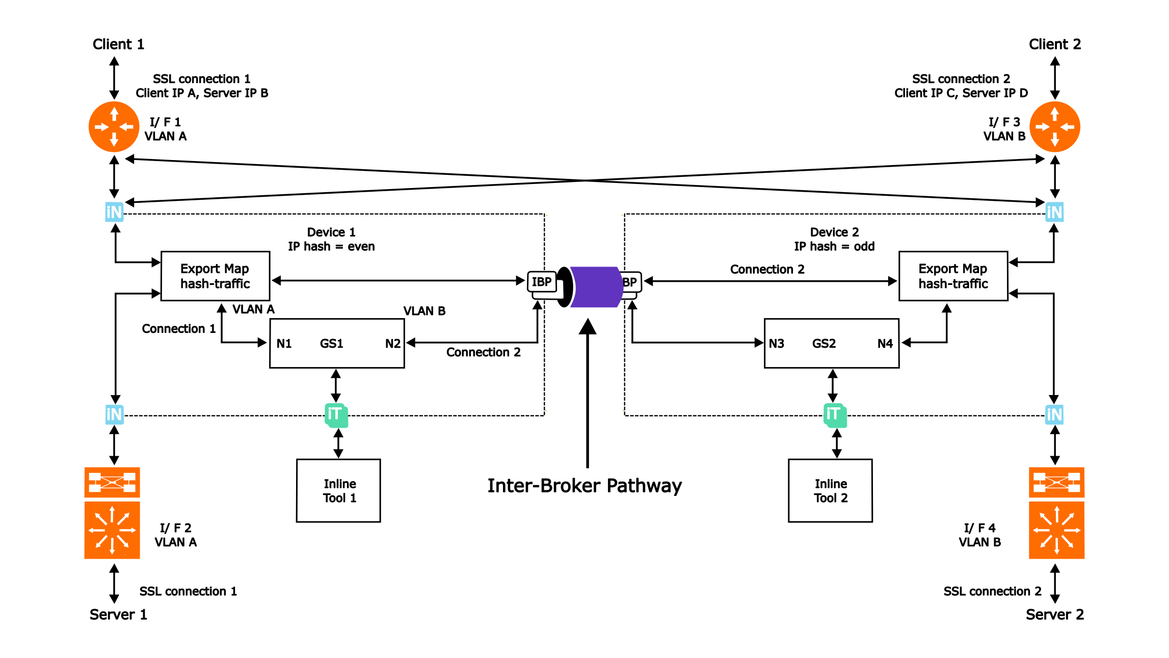 In the Resilient Inline Arrangement described below, interface (I/F) 1 and I/F 2 are linked to node 1, while I/F 3 and I/F 4 connect to node 2. For connection 1, client 1's traffic from I/F 1, which has a VLAN A source and an IP address A, will be directed to GS1 in node 1 because the last decimal digit of IP A is even. Similarly, the traffic from server 1 of the same connection, originating from I/F 2 with VLAN A and destination IP A, will also be routed to GS1 in node 1.