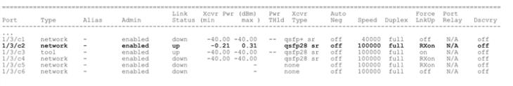 When forcelinkup is enabled on a 100Gb network port on PRT-HD0-C06X24, the output of the show port and show port params commands display RXon as follows: