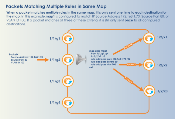1 illustrates how Flow Mapping® handles a case where a packet matches multiple rules in the same map. In cases like this, the packet is sent to all configured destinations when the first pass rule is matched (assuming there were no matching drop rules – drop rules have higher priority). You can see the port statistics illustrating this in 2.