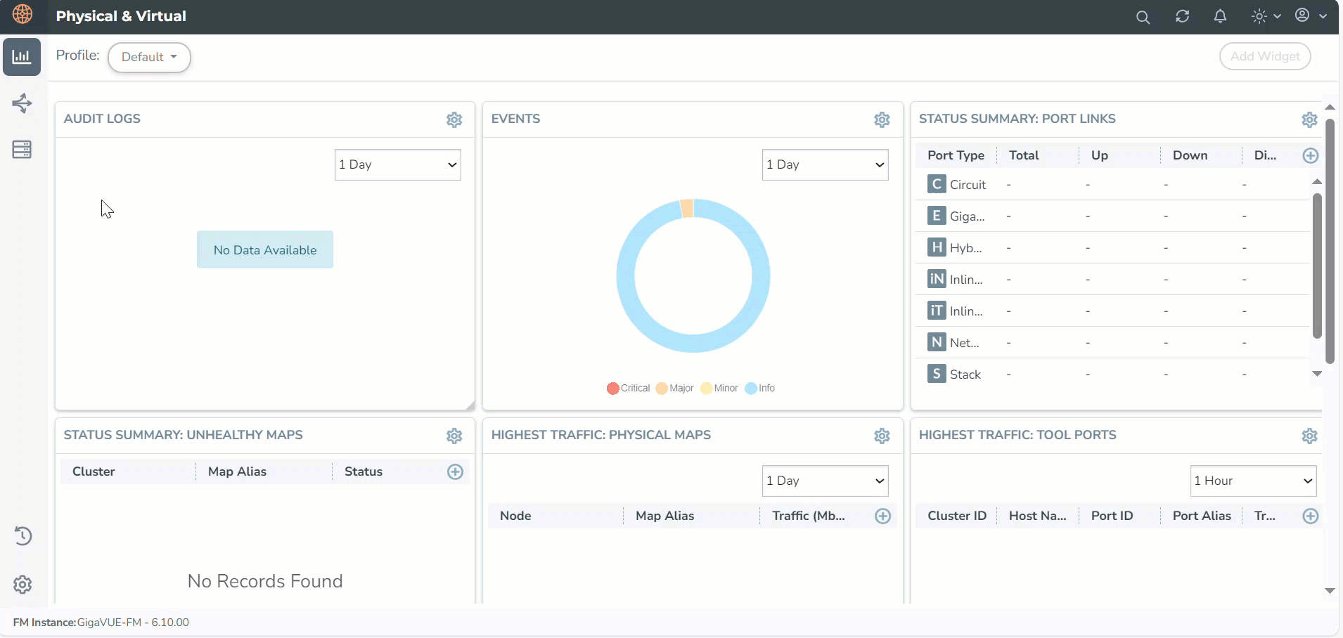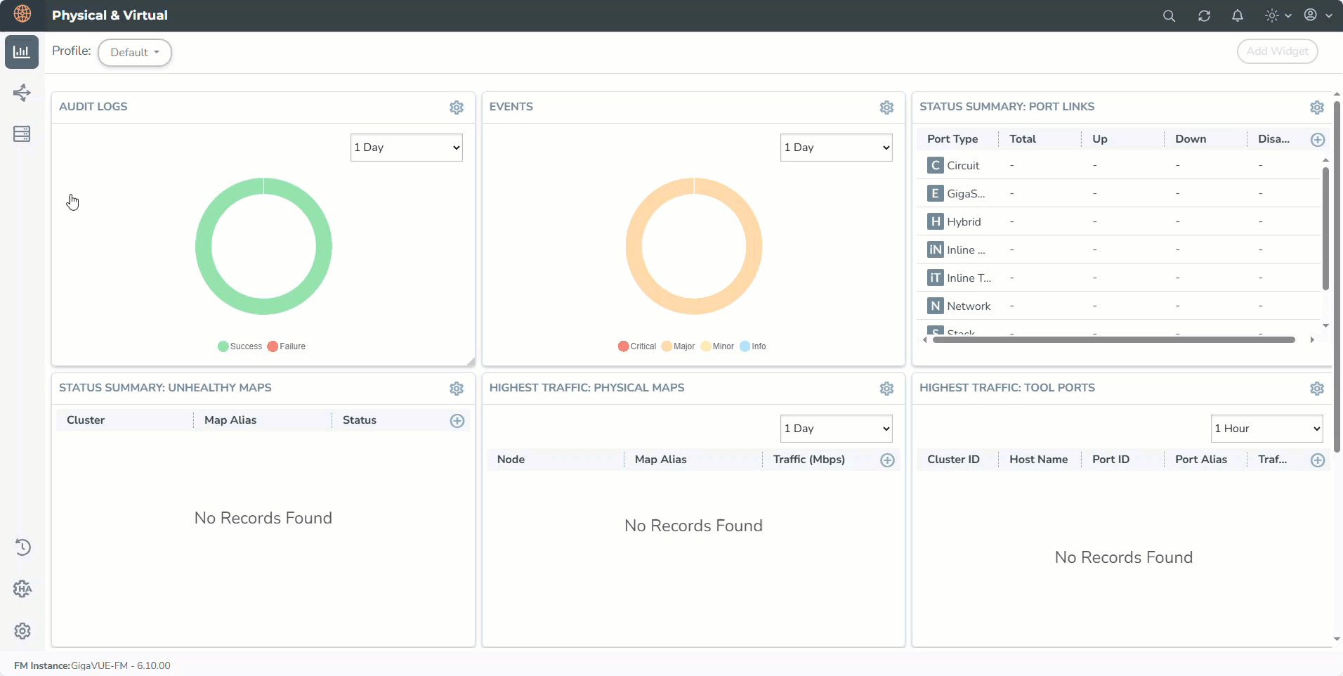 Displays the Monitoring Domain details and the connectivity status from GigaVUE-FM to Cluster. The count of reachable and unreachable clusters per Monitoring Domain. |