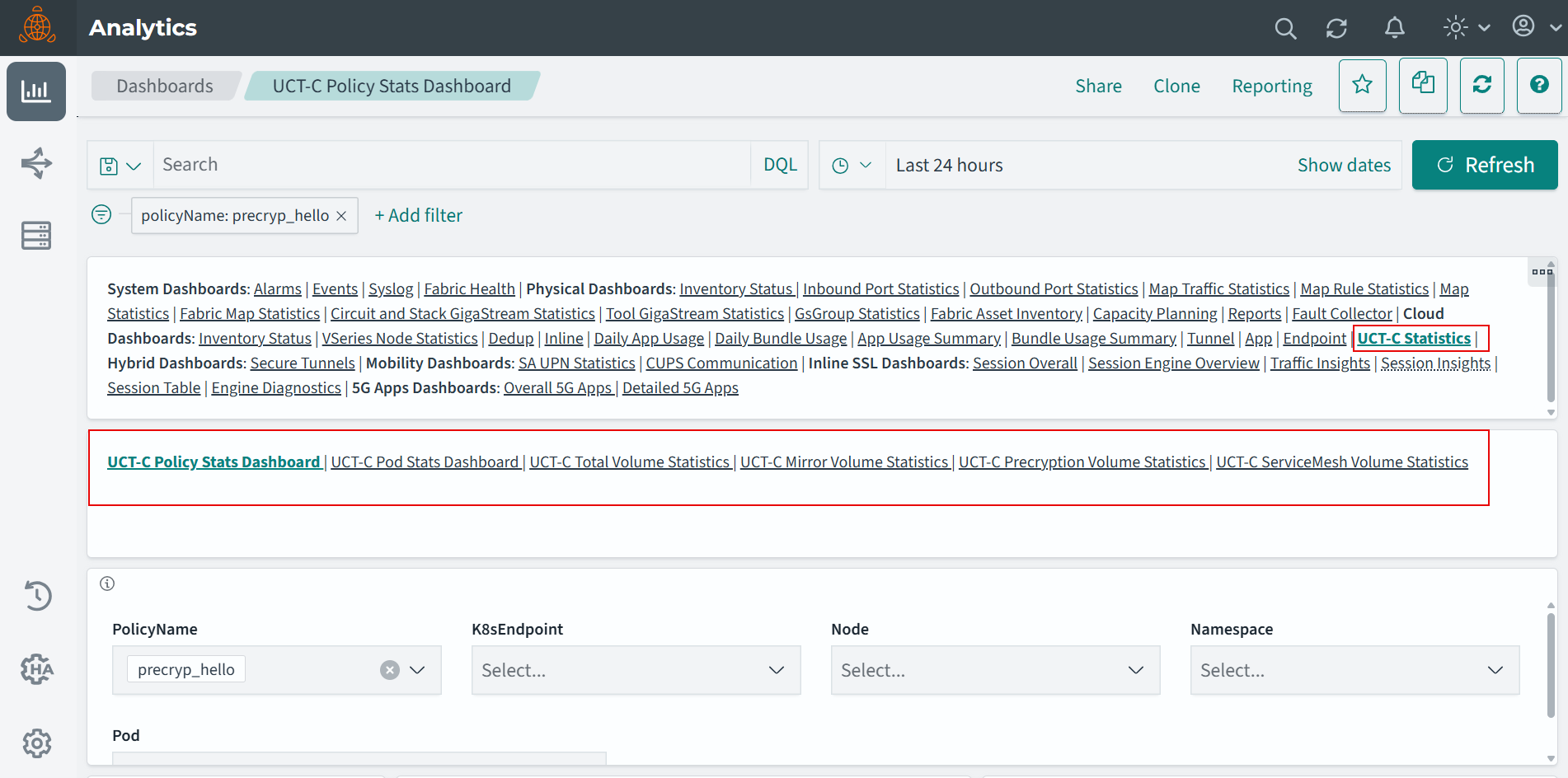 - On the Dashboard, select UCT-C Policy Stats Dashboard to view visualizations for Policy statistics.