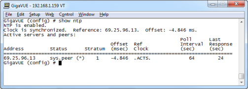 | 1. | Specify the address of the time GigaVUE HC Series server. For example, if the time server is on 192.168.1.10, you would use the following command: |