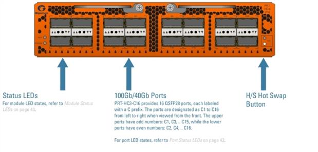 The PRT-HC3-C16 module provides sixteen 100Gb QSFP28 ports for a maximum capacity of 1600Gb.