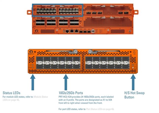 The PRT-HC3-X24 module provides a total 240Gb/600Gb of connectivity with line rate on-board switching across twenty-four 10Gb/25Gb SFP+, SFP28, and SFP+ Copper ports. Refer to 1 PRT-HC3-X24 Module.