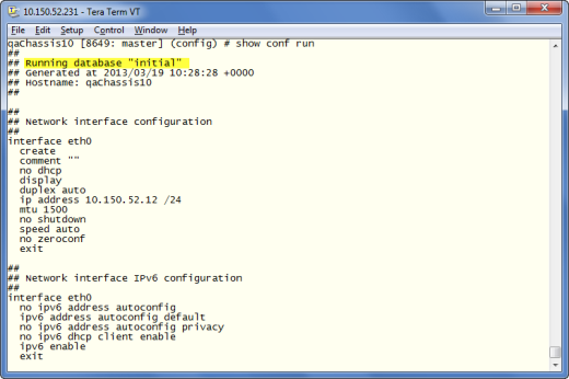 Note: The name of the factory-provided configuration file is initial. You can see the name of the most recently booted configuration file by using the show running-configuration command (or show configuration) and look for the ## Running database entry. In 1, you can tell that the GigaVUE H Series node is currently operating with the initial configuration file.