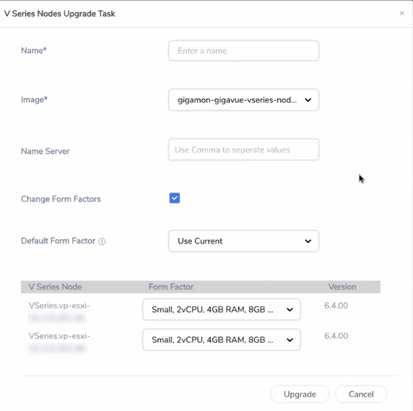 When upgrading the GigaVUE V Series Nodes to any version equal to or greater than 6.5.00, the Name Server field is displayed. This field is optional. Name Server is a server that stores the mapping between the domain names and the IP address. The maximum number of name servers that can be entered is three. Enter valid IPv4 address, separated by comma. - (Optional) Select the Change Form Factors check box if you want to modify the form factor (instance) size.