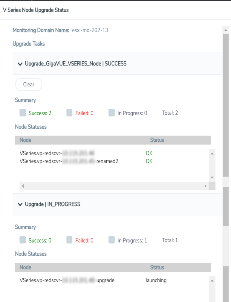 - Select Clear to delete the monitoring domain upgrade status history of successfully upgraded nodes.