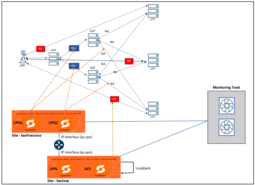 The following example illustrates the deployment of Gigamon Subscriber-Aware Filtering and Advance Flow Slicing (AFS) solution in a service provider's 5G mobile core network that has Gigamon devices deployed at two sites such as San Francisco (CPN) and San Jose (UPN).